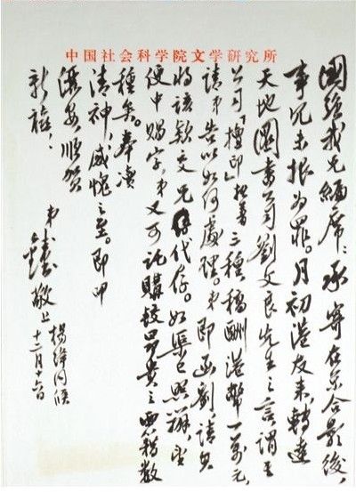 上圖釋文 錢鐘書一九八年十二月十六日致李國(guó)強(qiáng) 國(guó)強(qiáng)我兄編席:承寄在京合影后,事冗未報(bào)為罪。月初港友來(lái),轉(zhuǎn)達(dá)天地圖書公司劉文良先生之言,謂其公司“擅印”拙著三種,稿酬港幣一萬(wàn)元,請(qǐng)弟告以如何處理。弟即函劉,請(qǐng)其收該款交兄代存。如渠已照辦,望便中賜字,弟又可購(gòu)較昂貴之西籍?dāng)?shù)種矣。奉瀆清神,感愧之至。即叩 儷安,順賀 新禧!弟錢鍾