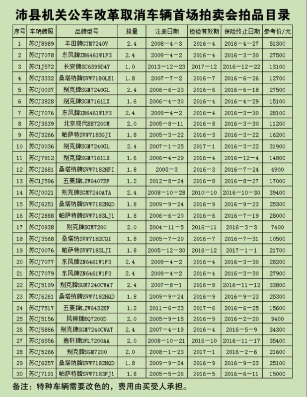 沛縣機關(guān)公車改革取消車輛拍賣會拍品目錄