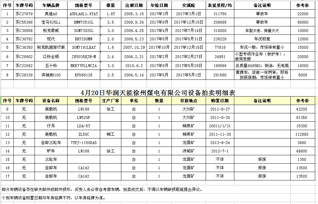 華潤天能徐州煤電有限公司車輛拍賣明細表