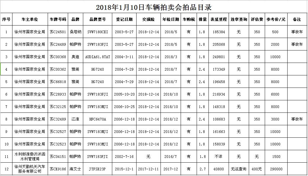 關(guān)注微信公眾號(hào)我公司受委托,定于2018年1月10日10時(shí)在徐州市中山南路55號(hào)三樓本公司拍賣大廳公開拍賣各型汽車11輛。主要有帕薩特6輛、雅閣2輛、奧迪1輛、桑塔納1輛、江淮1輛。