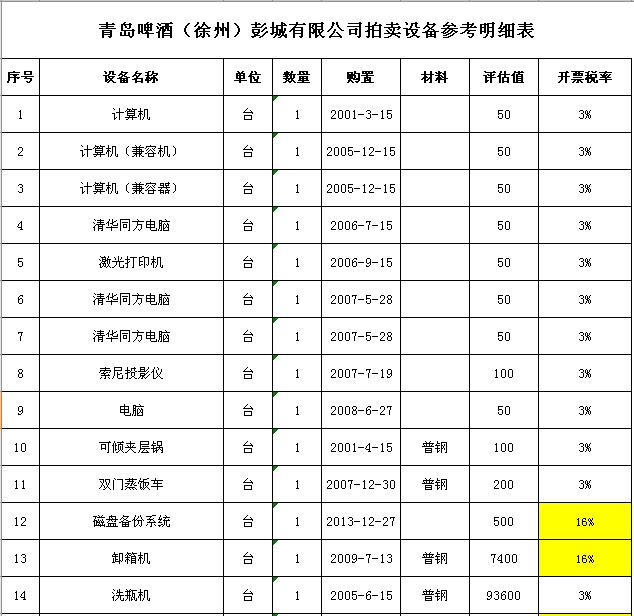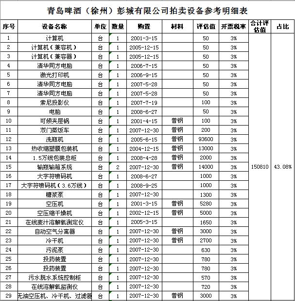 關(guān)注微信公眾號受委托,我公司定于2018年 9月28日10:00通過中國拍賣行業(yè)協(xié)會網(wǎng)絡(luò)拍賣平臺以網(wǎng)絡(luò)競價的方式公開拍賣:青島啤酒(徐州)彭城有限公司廢舊設(shè)備一批,主要包括:洗瓶機(jī)、灌酒壓蓋機(jī)、殺菌機(jī)、包裝機(jī)、輸瓶輸箱系統(tǒng)、辦公設(shè)備等。