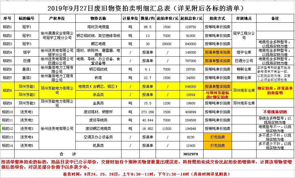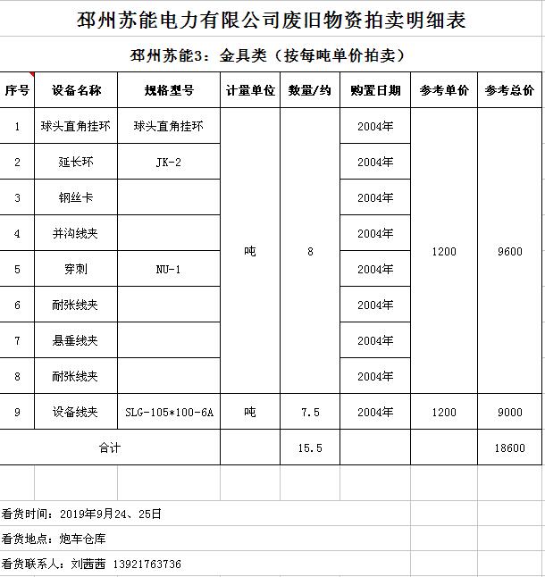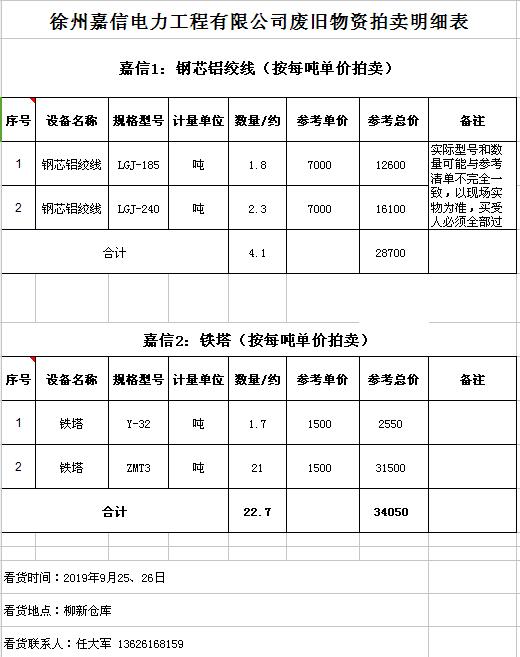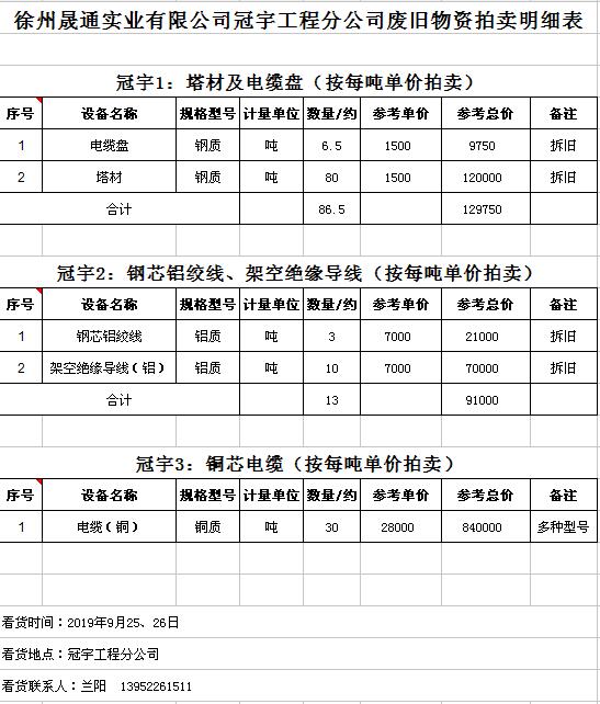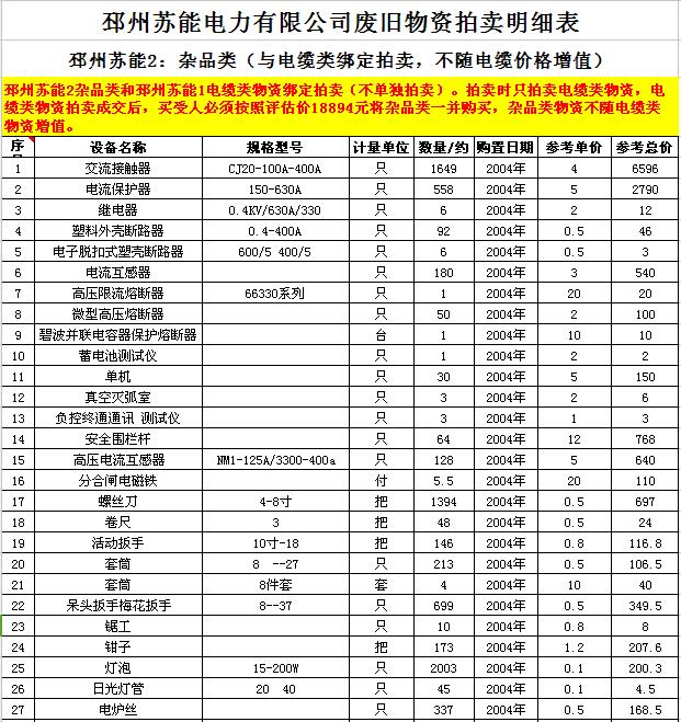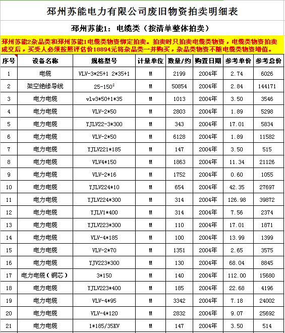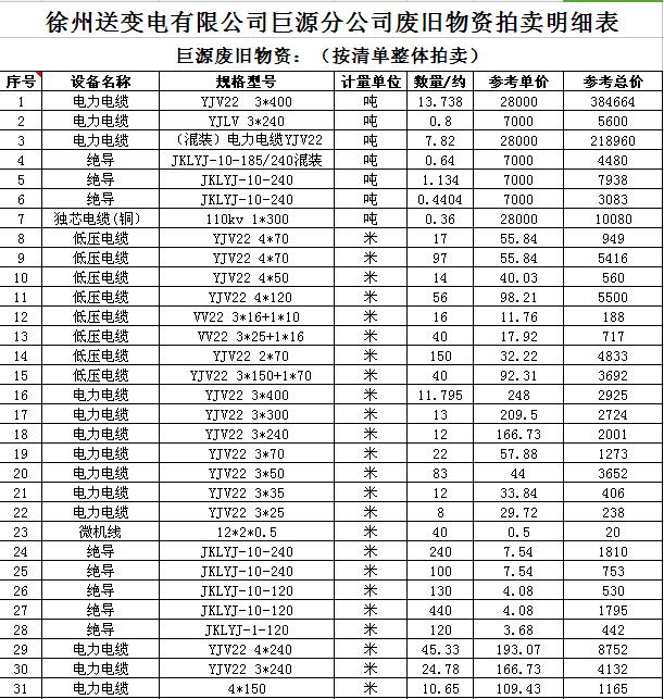 關注微信公眾號受委托,我公司將通過中國拍賣行業(yè)協(xié)會網(wǎng)絡拍賣平臺以網(wǎng)絡競價的方式公開拍賣廢舊電力物資一批,主要包括:電纜、導線、廢舊鋼材、鋼芯鋁絞線、金具、雜品、機具、空調、辦公設備等。