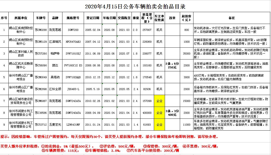 關(guān)注微信公眾號(hào)受委托,我公司定于2020年4月15日13:30時(shí)在徐州市銀地二手車交易市場(chǎng)四樓東南拍賣大廳通過(guò)現(xiàn)場(chǎng)和汽車街網(wǎng)絡(luò)拍賣平臺(tái)同步進(jìn)行的方式公開(kāi)拍賣以下車輛:①05年蘇CM0288君越;②07年蘇CM5129江淮瑞風(fēng);③11年蘇C5726G帕薩特;④10年蘇CM6067君越;⑤08年蘇C38586君越;⑥11年蘇C53712五菱宏光;⑦08年蘇C5609G捷達(dá);⑧10年蘇CM0049桑塔納;⑨05年蘇CM2898江鈴全順。