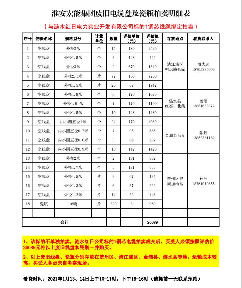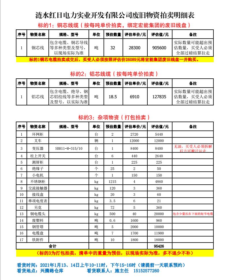 關(guān)注微信公眾號受委托,我公司將通過中拍平臺以網(wǎng)絡(luò)競價的方式公開拍賣以下單位廢舊電力物資。主要包含:廢舊電纜盤、銅芯電纜、鋁芯電纜、鋼管塔、鐵附件、開關(guān)柜、變壓器、雜項物資等。