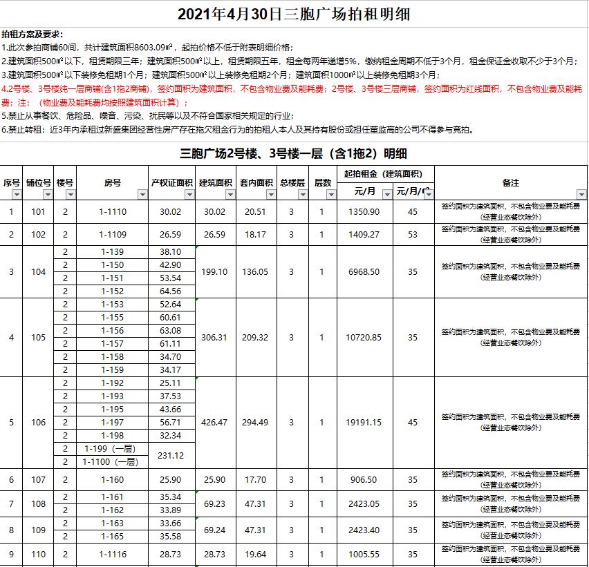 關注微信公眾號我公司受委托,定于2021年4月30日10時在徐州市中山南路55號三樓本公司拍賣廳公開拍租:新盛集團位于三胞廣場商鋪及辦公房一批,面積分別為數(shù)十至數(shù)百平米不等,均為閑置。租期3-5年。禁止從事危險品、有污染及擾民的行業(yè)經(jīng)營。