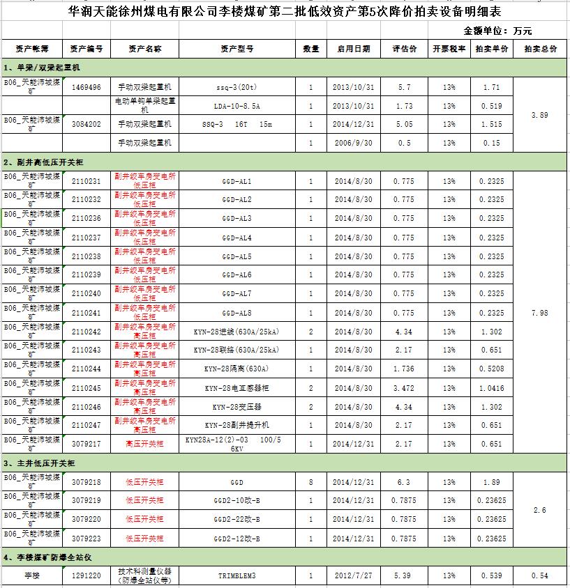 2、華潤(rùn)天能李樓煤礦二手礦用設(shè)備一批。主要包括:主副井提升機(jī)、主副井電控裝置、單雙梁起重機(jī)、副井高低壓開(kāi)關(guān)柜、主井低壓開(kāi)關(guān)柜、防爆全站儀等。(保證金10萬(wàn)元)