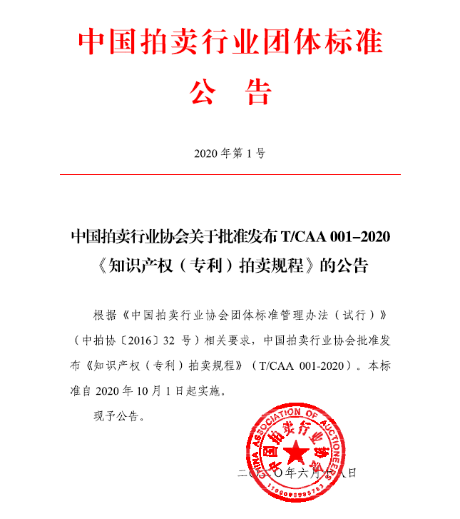 《知識產(chǎn)權(quán)(專利)拍賣規(guī)程》(T/CAA 001-2020)